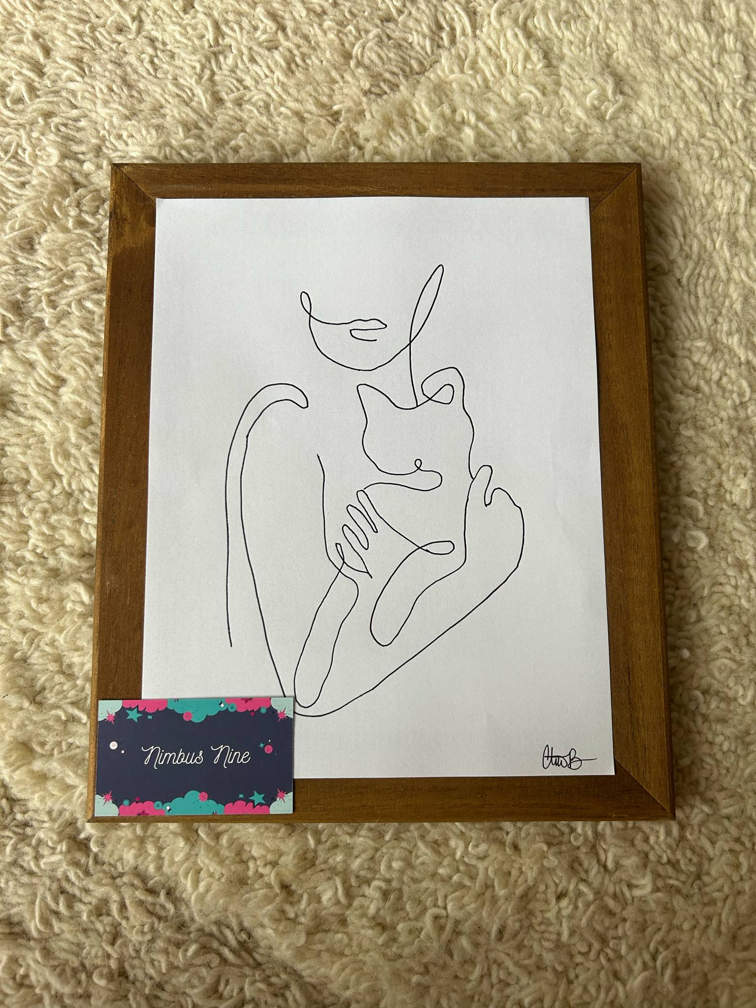 Hand drawn line art design of a cat in a woman's arms.